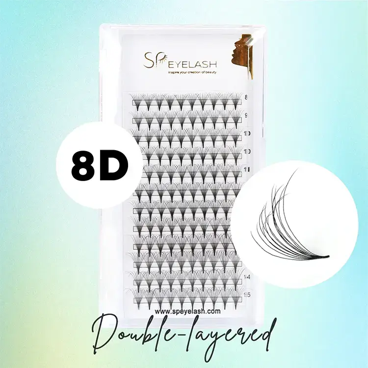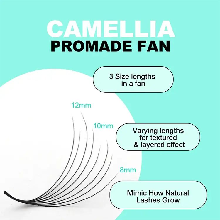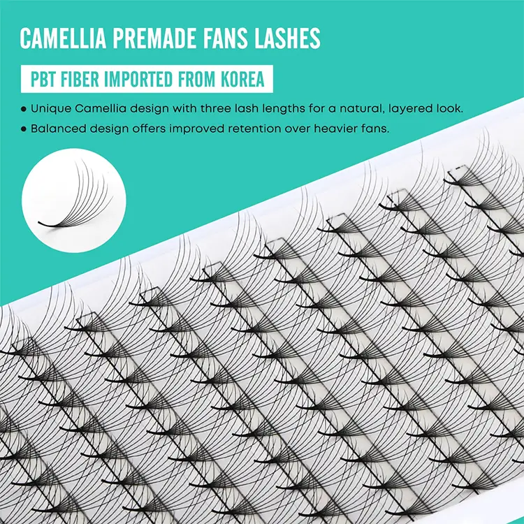 8 डी डबल कैमेलिया प्रोमेड फैन लैशेस दक्षिण कोरिया से आयातित पीबीटी सिंथेटिक बालों का उपयोग करता है, जो हल्के, नरम है, और एक प्राकृतिक चमक है। पारंपरिक सिंथेटिक ऊन की तुलना में, पीबीटी सामग्री लगभग 30% तक वजन कम करती है और इसमें महीन युक्तियां होती हैं। कैमेलिया प्रोमेड के प्रशंसक सभी हस्तनिर्मित हैं, पतले और यहां तक कि जड़ों और सममित पुष्प व्यवस्था के साथ।